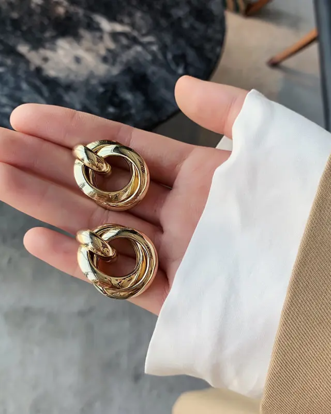 Gold circle earrings, Double hoop design, Stud earrings, Polished finish, Elegant accessory, Modern style, Statement jewelry, Fashionable, Gold-plated, Goldene Kreisohrringe, Doppelreif-Design, Steckerohrringe, Polierte Oberfläche, Elegantes Accessoire, Moderner Stil, Statement-Schmuck, Modisch, Leichtgewicht
